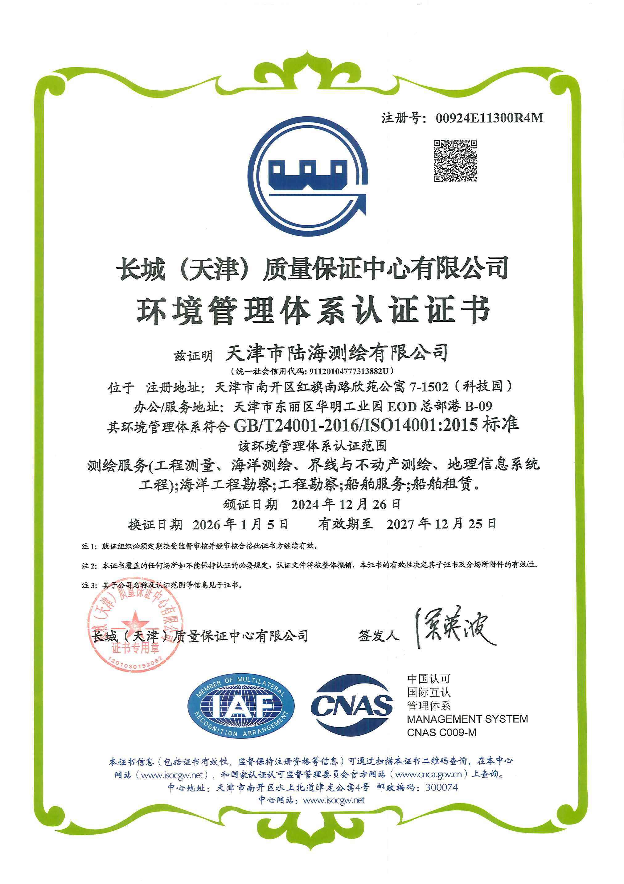 环境管理体系认证证书